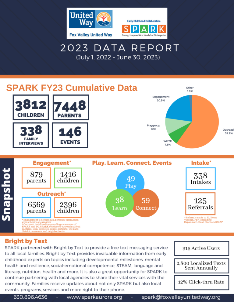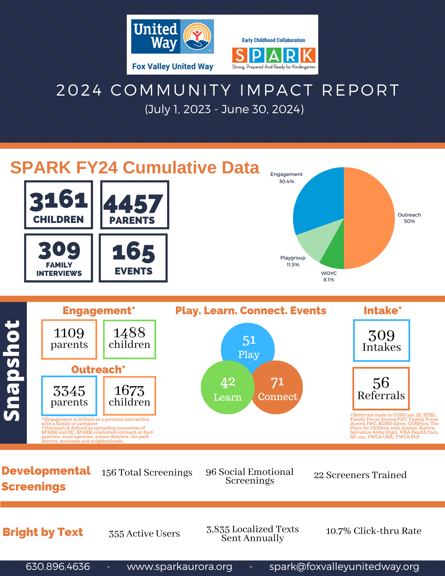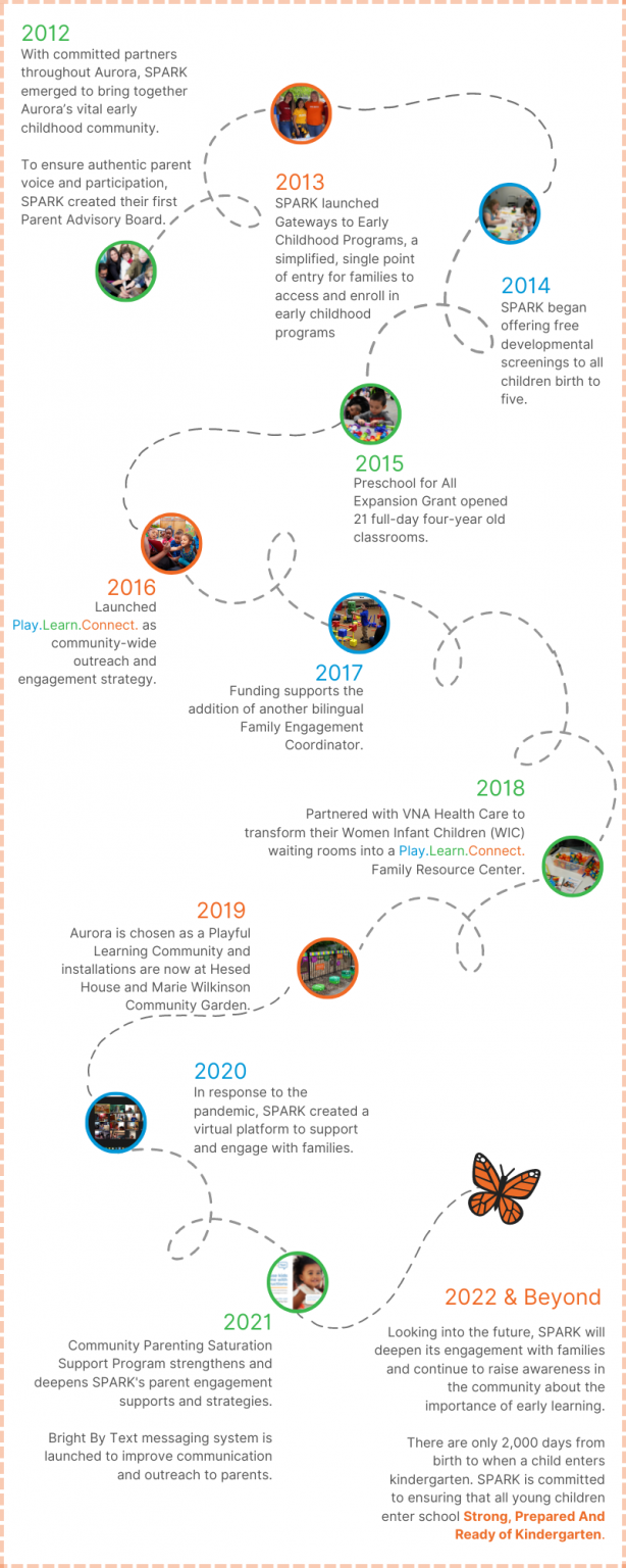SPARK is dedicated to empowering parents as a child’s first and most important teacher. We help children thrive by ensuring all families have what they need for a child to succeed in school and life. Since 2012, we have impacted over 10,000 families and over 12,000 children. Children are at the heart of what we do. For more than a decade, SPARK has worked to ensure every child has the best start in life, and we will continue working for the families of Aurora for another decade and beyond!